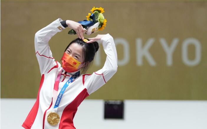 2021年7月24日,杨倩在颁奖仪式上。当日,在东京奥运会射击女子10米气步枪决赛中,中国选手杨倩夺冠,赢得东京奥运会首枚金牌。新华社记者 鞠焕宗 摄