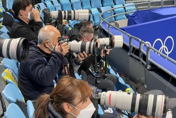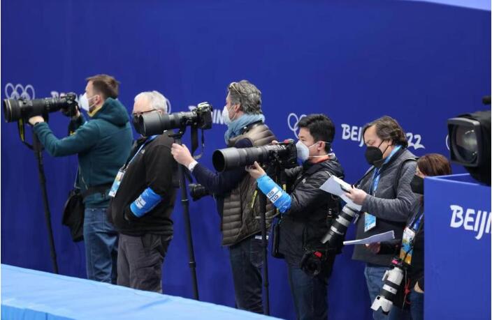 2月5日,记者兰红光(中)在拍摄北京2022年冬奥会短道速滑项目。新华社记者杨磊摄