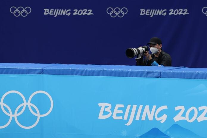 2月5日,记者曹灿在拍摄北京2022年冬奥会短道速滑项目。新华社记者杨磊摄