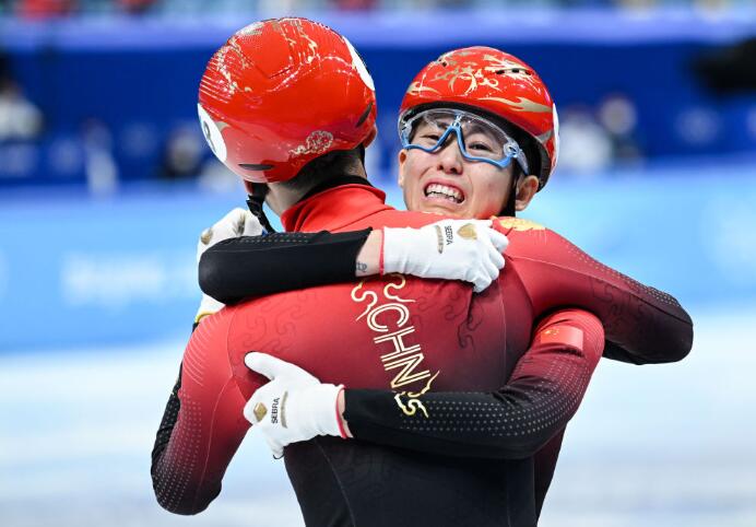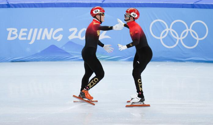 2月5日,中国队选手任子威(左)与队友武大靖在比赛后庆祝。新华社记者 李一博 摄