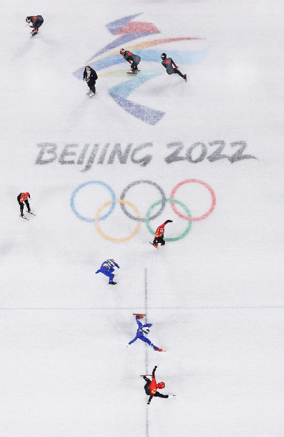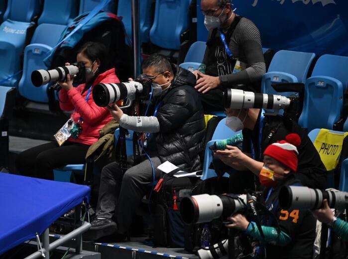 2月5日,记者鞠焕宗(左四)在拍摄北京2022年冬奥会短道速滑项目。新华社记者杨磊摄