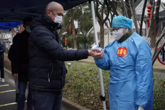 昆山康桥学校外教劳伦斯(左)主动参加花桥核酸检测点志愿者活动