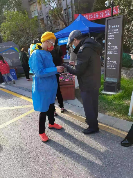 核酸检测现场,一些外国人不了解检测流程,施爱伦耐心地用英文和他们交流,帮助他们了解相关政策,协助工作人员开展信息登记、录入等工作。