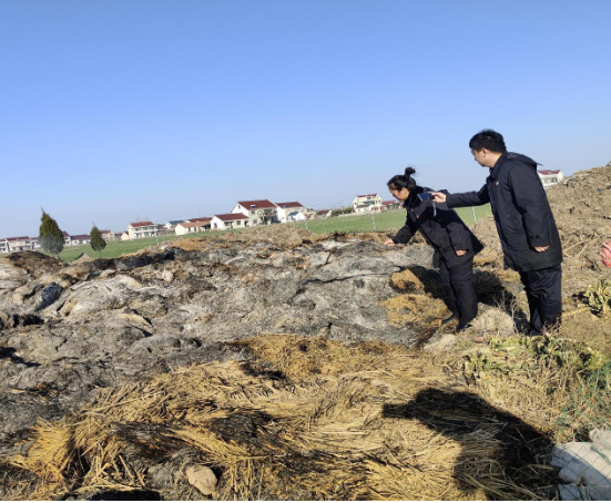 2023年1月29日,当如东检察院干警在志愿者带领下来到老陈家附近时,这处秸秆堆场的明火尚未完全熄灭,大量烟尘把周边村居笼罩其中。走近一看,临时堆场内也并非只有秸秆,大量生活垃圾、建筑垃圾、死禽与秸秆混杂堆放,已经漫溢至边上的农路。周边村民见有检察干警来,纷纷围上来反映情况。