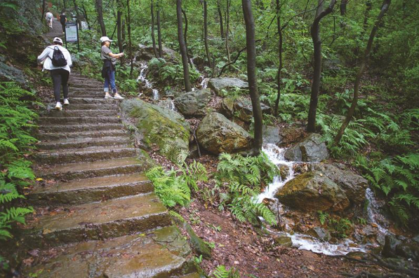 20日,雨后的惠山北坡石门古道旁溪水潺潺。景区管理部门提醒游客,雨后溪涧水流湍急、石块湿滑,溯溪很容易发生意外。(卢易)