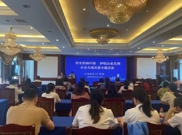 为推进辖区企业合规管理建设,助力企业高质量发展,6月14日,由江北新区宣传统战部和大厂街道主办、大厂街道商会承办的 “优化营商环境 护航企业发展” 企业合规发展主题讲座在大厂街道办事处顺利举办。大厂街道商会相关负责人及街域内60家企业近100人共同参与学习了企业合规管理相关政策,开拓了企业合规发展新思路。