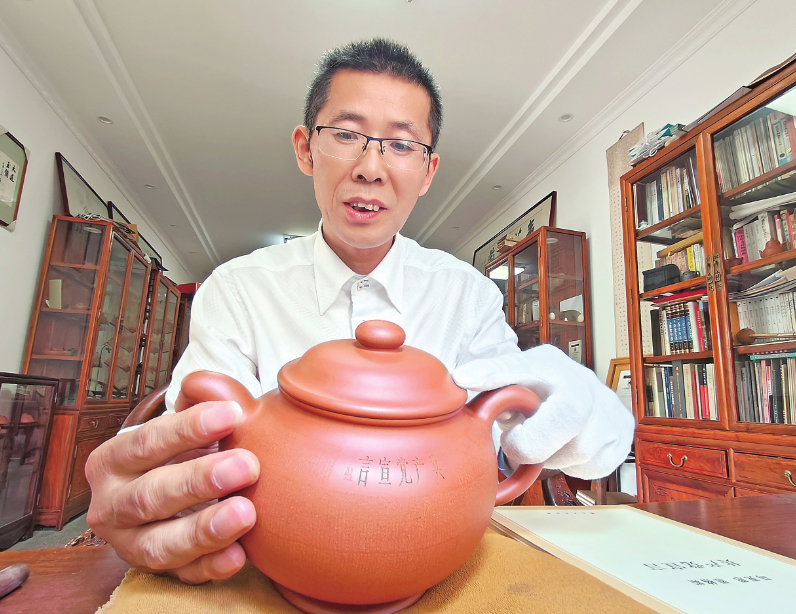 6月27日,宜兴市微雕艺人於成安正在展示刻有《共产党宣言》的紫砂壶。