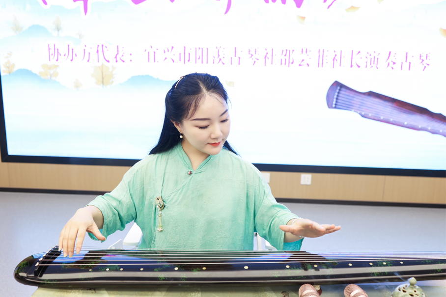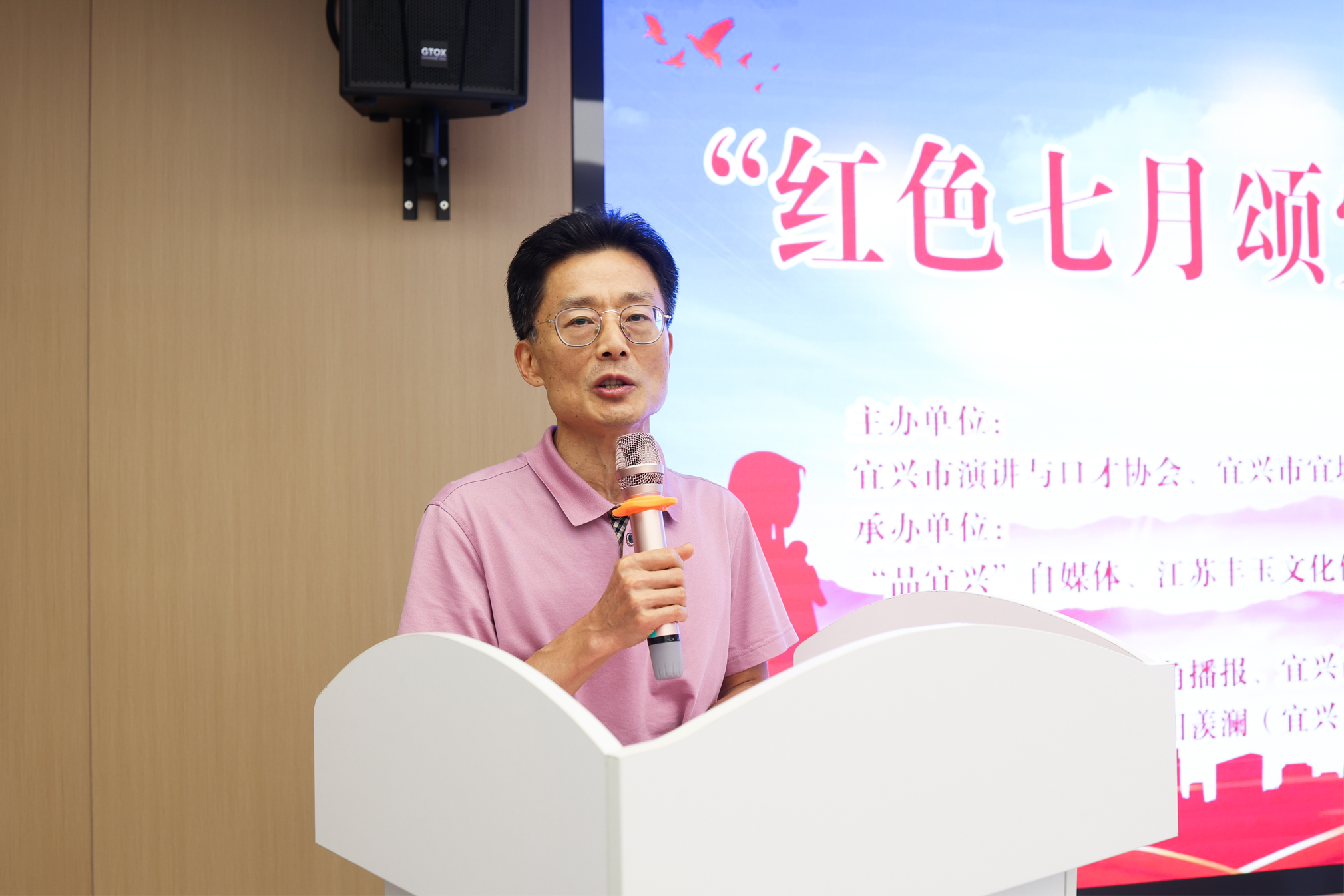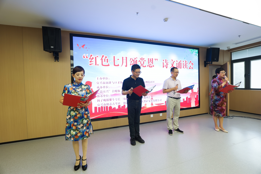 “红色七月颂党恩”诗文朗读会上,各位演讲与口才协会的朗诵爱好者用真挚的情感、生动的语言、饱满的热情,生动演绎了《史砚芬烈士写给弟弟妹妹的诀别信》《我的祖国》《我幸福我是宜兴人》《我的根在中国》等诗歌作品,表达了宜兴人民一心向党、永远跟党走的坚定信心和决心,抒发了对立足新时代、展现新作为的热烈向往,赢得了现场观众的阵阵掌声。协办单位代表,宜兴市阳羡古琴社社长邵芸菲女士舒缓的古琴演奏《半山听雨》,为炎炎夏日的活动增添了几许清凉意境。