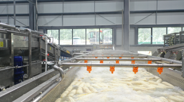 农业不加工,等于一场空。田间刚收获的玉米被直接送入了加工生产线,确保鲜食玉米的一个“鲜”字。在鲜食玉米加工车间,一棒棒金黄鲜亮、颗粒饱满的玉米“搭乘”流水线,经历挑选、剥皮、清洗、蒸煮、冷冻等程序后完美蜕变,成为市场“抢手货”。