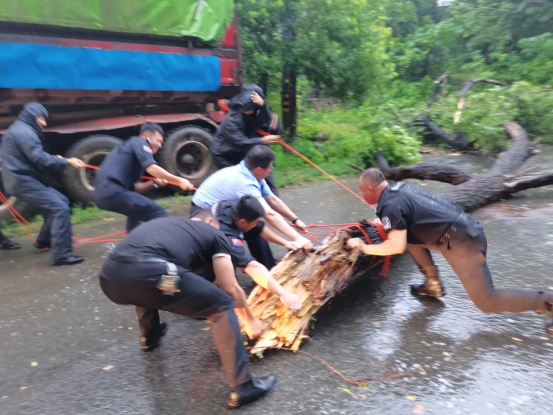 事不宜迟,两辆车上10余名民警立即冒雨下车,大家分工协作,一部分人做好后方车辆疏导工作,另一部分人将倒伏在路中央的大树进行搬运清理。