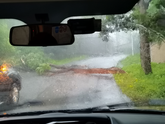 当日一早,镇江气象台发布雷暴大风黄色预警信号,大部分街道(镇)将出现雷电,并伴有8级以上的雷暴大风和短时强降水等天气。8时25分许,丹阳市公安局民警因执行任务驾车行驶在镇江市润州区扬句线上,行至某铁矿有限公司西北门附近时,突然发现前方路段有一棵大树倒伏在路中央,挡住了去路,从树木断裂面来看应该是被大风刮倒。