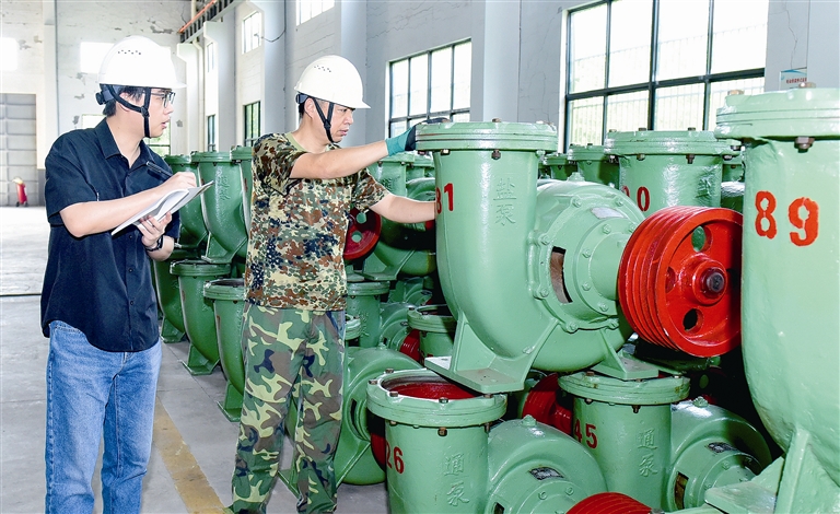 随着主汛期的到来,江阴市全力做好防汛物资准备工作。在防汛抗旱服务中心,混流泵、潜水泵、编织袋等各类防汛物资一应俱全;按照分级储备原则,各级各地防汛物资也储备充足。图为昨天上午,工作人员正对防汛设备进行例行保养维护,确保设备状态良好,在关键时刻发挥作用。(丁家骏)