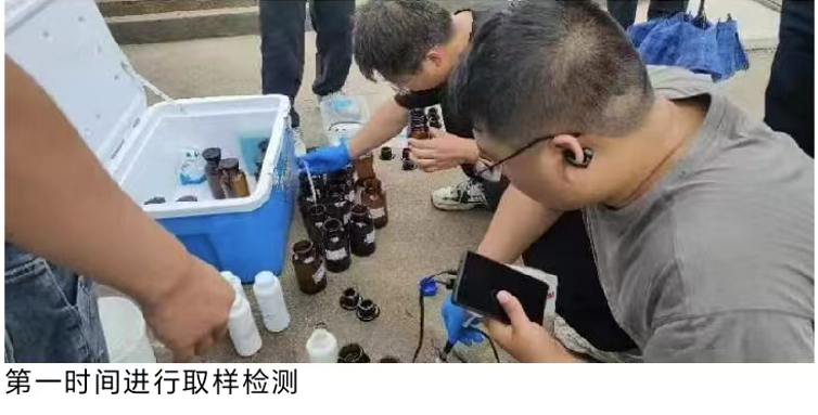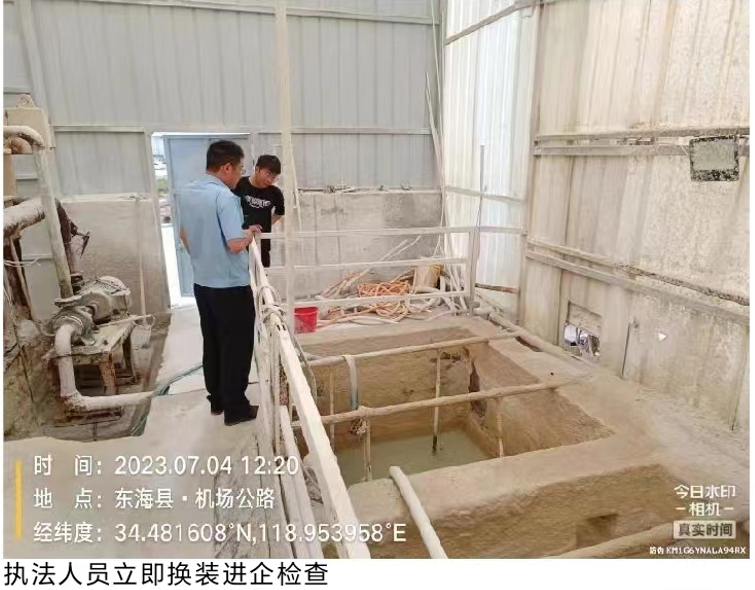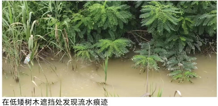 7月4日,开展了“2023雨燕行动”第一次突击检查。检查当天,执法人员全部穿着便装,乘坐无执法标志车辆来到东海县某工业园,采用分组走访周边群众、沿河沿沟排查和无人机巡查等多种手段,在一家企业围墙外的低矮树木遮挡处发现有流水痕迹、水质浑浊。通过无人机对企业厂区内进一步飞行巡查,锁定厂区的排口位置。执法人员立即按照事先制定好的检查预案兵分两路,一组执法人员安排第三方检测公司在排口和沟道内取样,同时继续使用无人机紧盯厂区内动向,另一组执法人员换上执法制服,亮证进厂直奔无人机锁定区域调查取证。最终通过两组执法人员的分工配合,第一时间取得了关键性证据,第三方检测机构现场测试该企业正在外排的废水PH值2.8,该企业涉嫌通过逃避监管的方式排放污染物、超标排放等环境违法行为初步锁定。