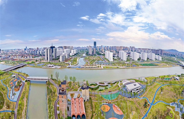 7月17日下午,一场雷阵雨过后,天空上演高颜值“水晶天”。图为在蓝天白云映衬下,锡澄运河公园呈现一派水清地绿的美景。(沈思远 摄)