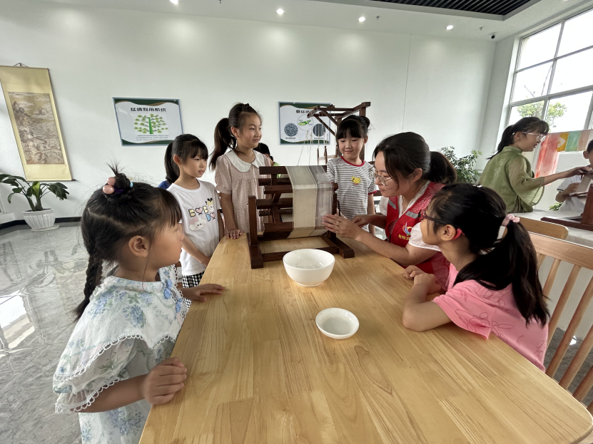 “同学们,这次绘画活动以‘蚕文化’为切入点,大家用图绘的方式呈现参观成果……”活动现场,志愿者引导学生们用心勾勒出五彩的图案,古老的蚕桑文化瞬间跃于画纸,藏于心间。同时,活动还安排手工互动环节,鼓励大家体验立缫机、煮茧机等,进一步了解蚕桑文化和农耕文化,感悟中国悠久的文化底蕴。