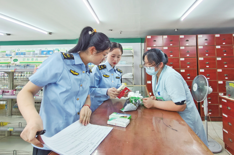 图为7月20日,执法人员在城区一药店进行检查。