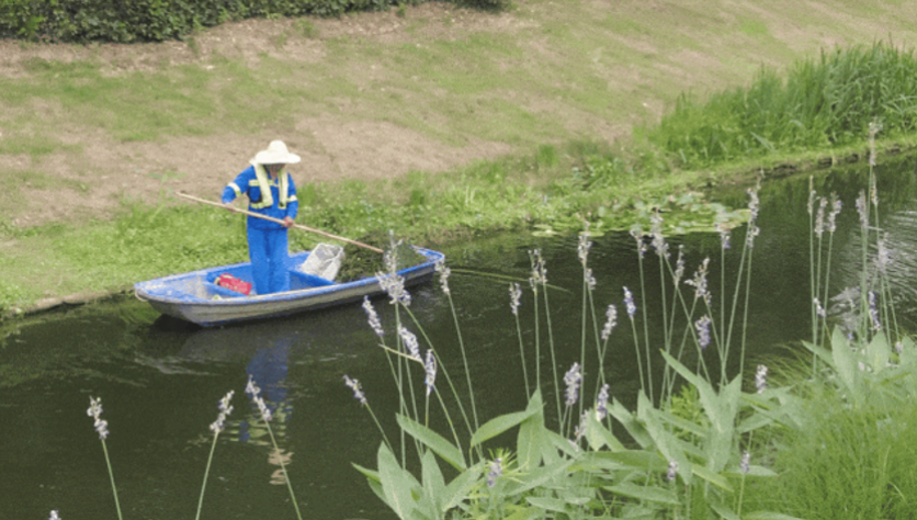 人工维护碧水常清。定康河清澈的背后,也离不开河道清洁员的定期清理。河面上,每天都会出现一两个蓝色身影,划着小船,用长柄网兜收集水中杂物。只见轻轻一舀,杂物便直接进入网兜里,河面变得更加干净。