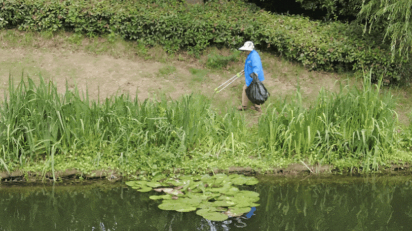 在岸边,也有工作人员不时地拾捡隐藏在草丛里的垃圾。他们用一把大钳子、一个塑料袋,清走了杂物,留下了干净整洁、草木繁茂的美好。