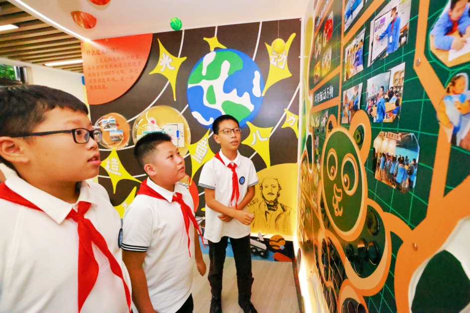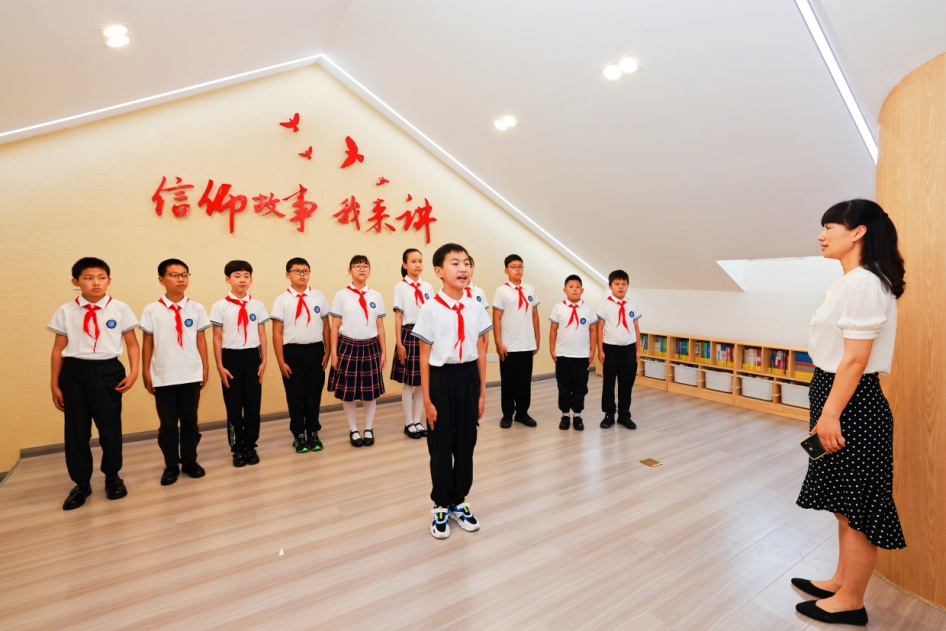 据介绍,三楼是少先队员阅读信仰故事、演绎红色故事的空间。“少年有志 强国有我”作为主线贯穿整个空间,少先队员们将在这里沉浸式体验仪式教育、观摩少先队校外实践教育成果展示,参与科学、劳动、红色剧目排演的“红领巾学堂”。