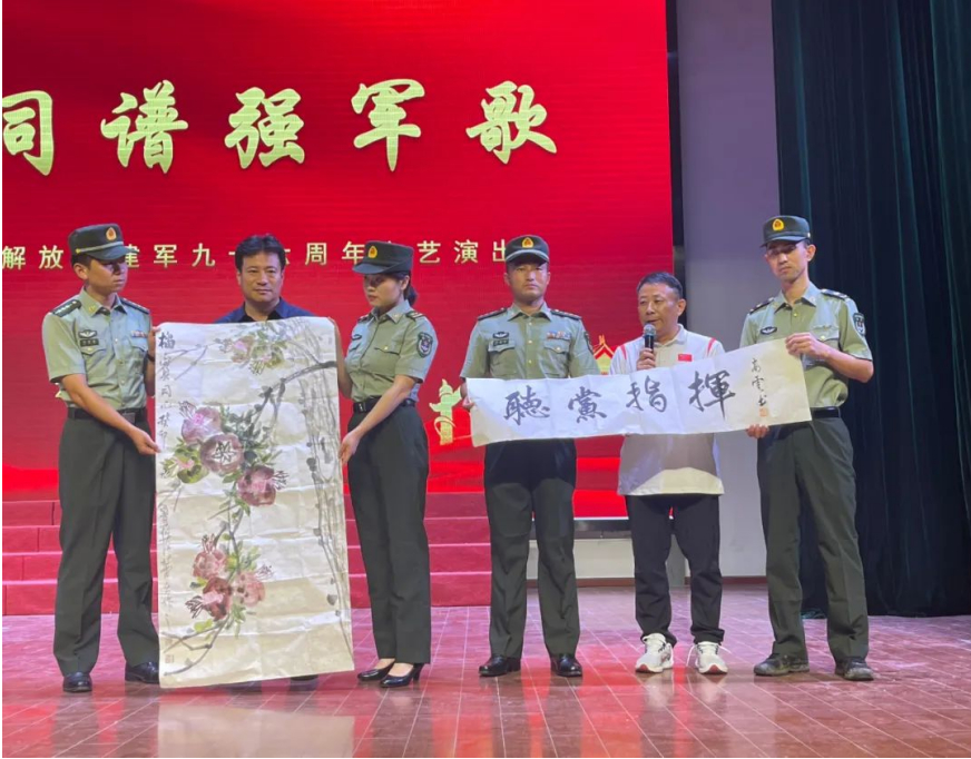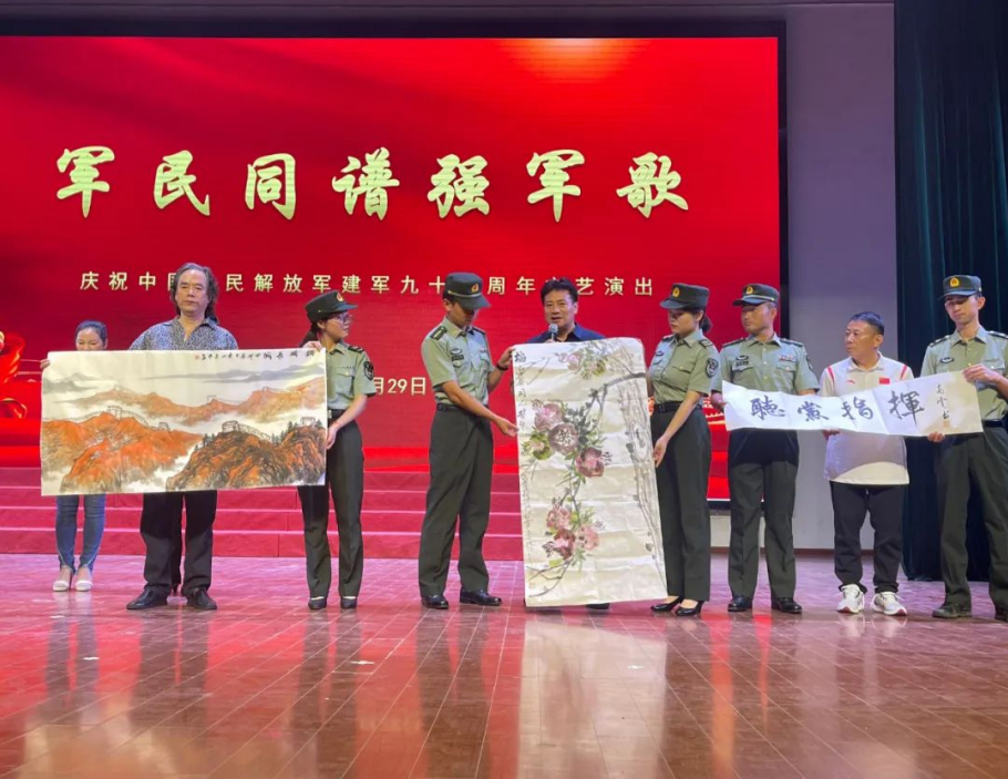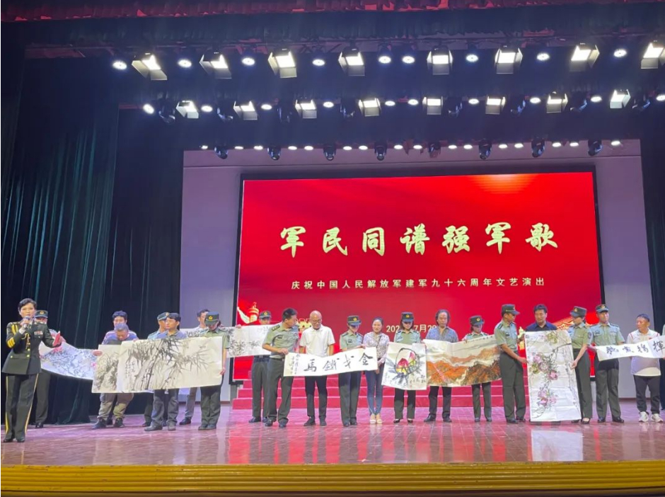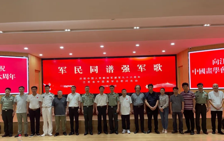 近日,由江苏省军区政治工作局、镇江市军分区、镇江市退役军人事务局、句容市委市政府、江苏红色文化研究委员会、江苏省中国画学会等联合举办的“军民同谱强军歌——庆祝中国人民解放军建军九十六周年双拥共建活动”在镇江举行。江苏省军区政治工作局主任陈勇,镇江军分区副司令员怀前进,镇江市退役军人事务局副局长侯阳锦,句容市委副书记赵树锋,江苏省中国画学会理事长王强,中国画学会副秘书长、江苏省中国画学会副会长兼秘书长翟优,江苏省中国画学会常务理事、南京邮电大学艺术学院原院长王平,江苏省中国画学会常务理事、南京工业大学兼职教授樊蕾,江苏省中国画学会理事、江苏省美术馆书画工作室主任吴振,江苏省中国画学会理事、南京特殊教育师范学院美术与设计学院院长赵健,江苏省中国画学会理事、更斯艺术馆执行馆长王昊,江苏省中国画学会理事陶金平,镇江市书法家协会主席曹秉峰,金陵友好协会副会长常林江等及部队官兵500余人参加了活动。