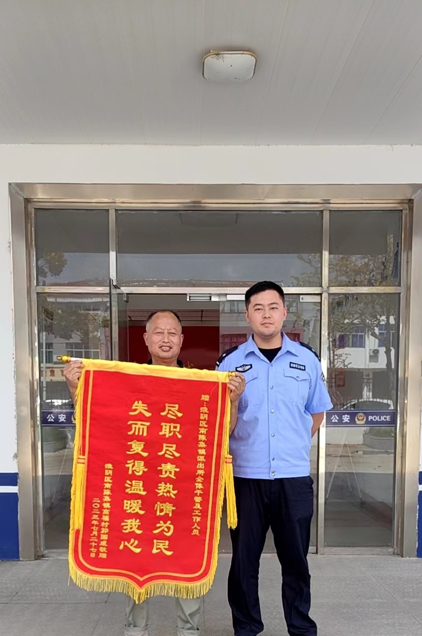 “真是太感谢你们了,要不是你们帮忙,我的手机肯定找不到了。”7月27日上午,市民李先生来到淮安市公安局淮阴分局南陈集派出所,将一面锦旗送到民警郑明俊手中,感谢民警及时帮其找回丢失的手机。