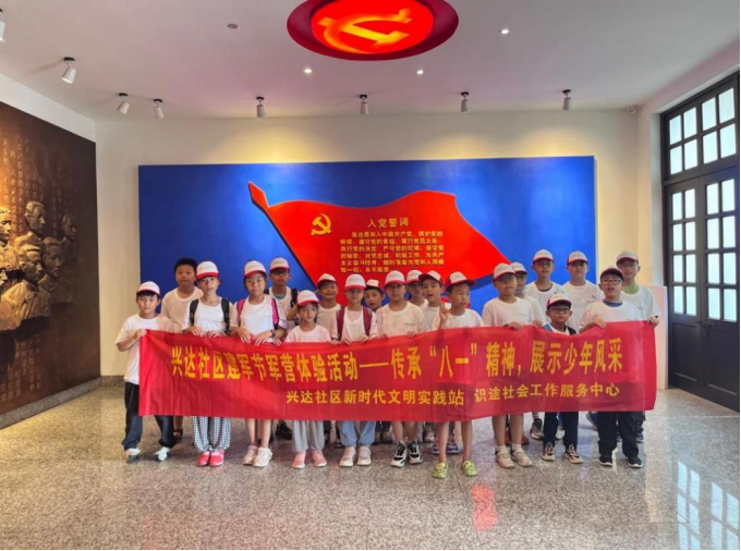 8月1日,南京市建邺区南苑街道兴达社区新时代文明实践站联合识途社会工作服务中心开展了系列主题活动,与青少年共迎八一建军节。辖区内老党员、退伍老兵、热心居民踊跃报名为志愿者,带领青少年们一同前往红色阵地参观学习,使大家了解革命历史,感受红色精神。