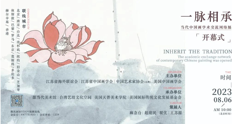 由江苏省海外联谊会、江苏省中国画学会、中国艺术家协会(台湾)、美国中国画学会共同主办的《一脉相承——当代中国画学术交流网络展》将于北京时间2023年8月6日上午10点开展。