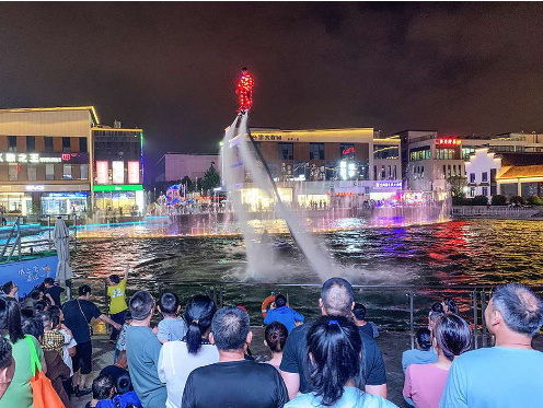南山湖水街总投资10亿元,是集餐饮服务、儿童体验、精品酒店等于一体的滨水生态型文化旅游商业综合体,自2020年1月12日正式对外营业以来,每年客流量超过300万,入选首批省级旅游休闲街区。图为市民在南山湖水街观看水上飞人表演。(卑多敏)