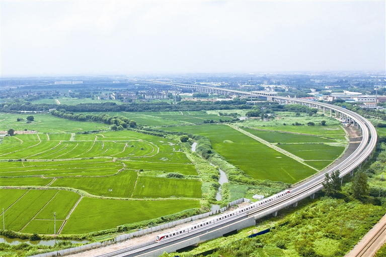 图为试验列车正驶向高架桥。(丁家骏 摄)