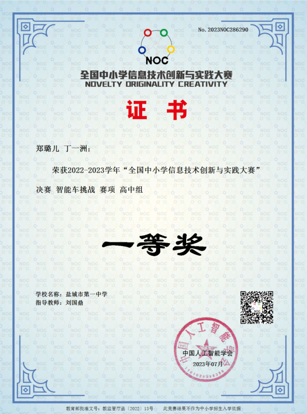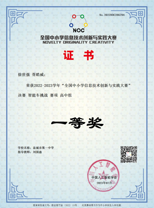 8月9日,从盐城市第一中学传出喜讯,学校的科技竞赛团队参加2022-2023学年“全国中小学信息技术创新与实践大赛”(NOC)总决赛成绩喜人,喜获嘉奖。