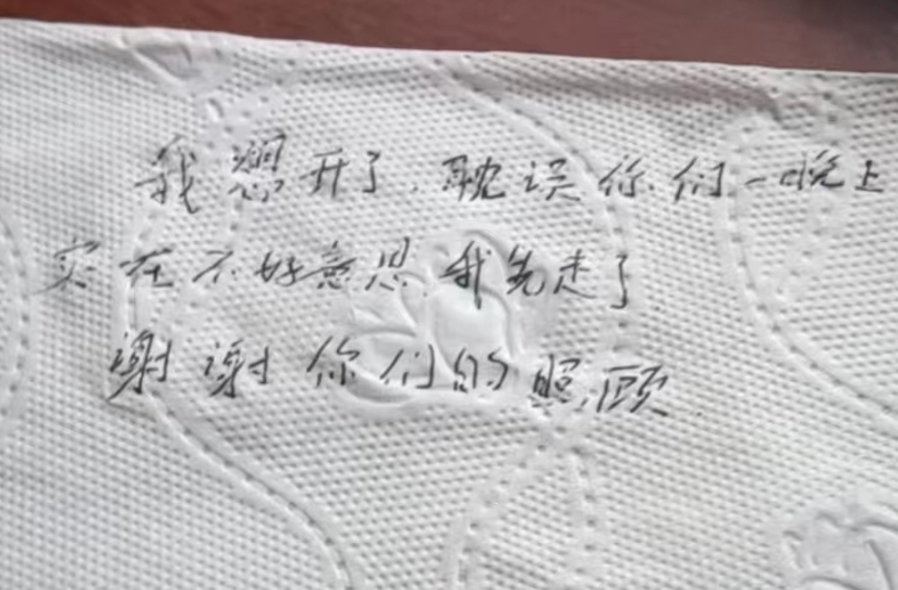 “我想开了,耽误你们一晚上,实在不好意思,我先走了,谢谢你们的照顾!”8月3日的一早,女子在回家前往民警袁晖的手里塞了一张小纸条写道。
