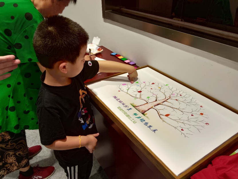 在签到处,来参与活动的社区居民将手指沾上喜欢的印泥颜色,按在了签到树上。原本只是一棵光秃躯干的签到树,在居民们你一下我一下的手指按印下,变成了一幅美丽的树画。