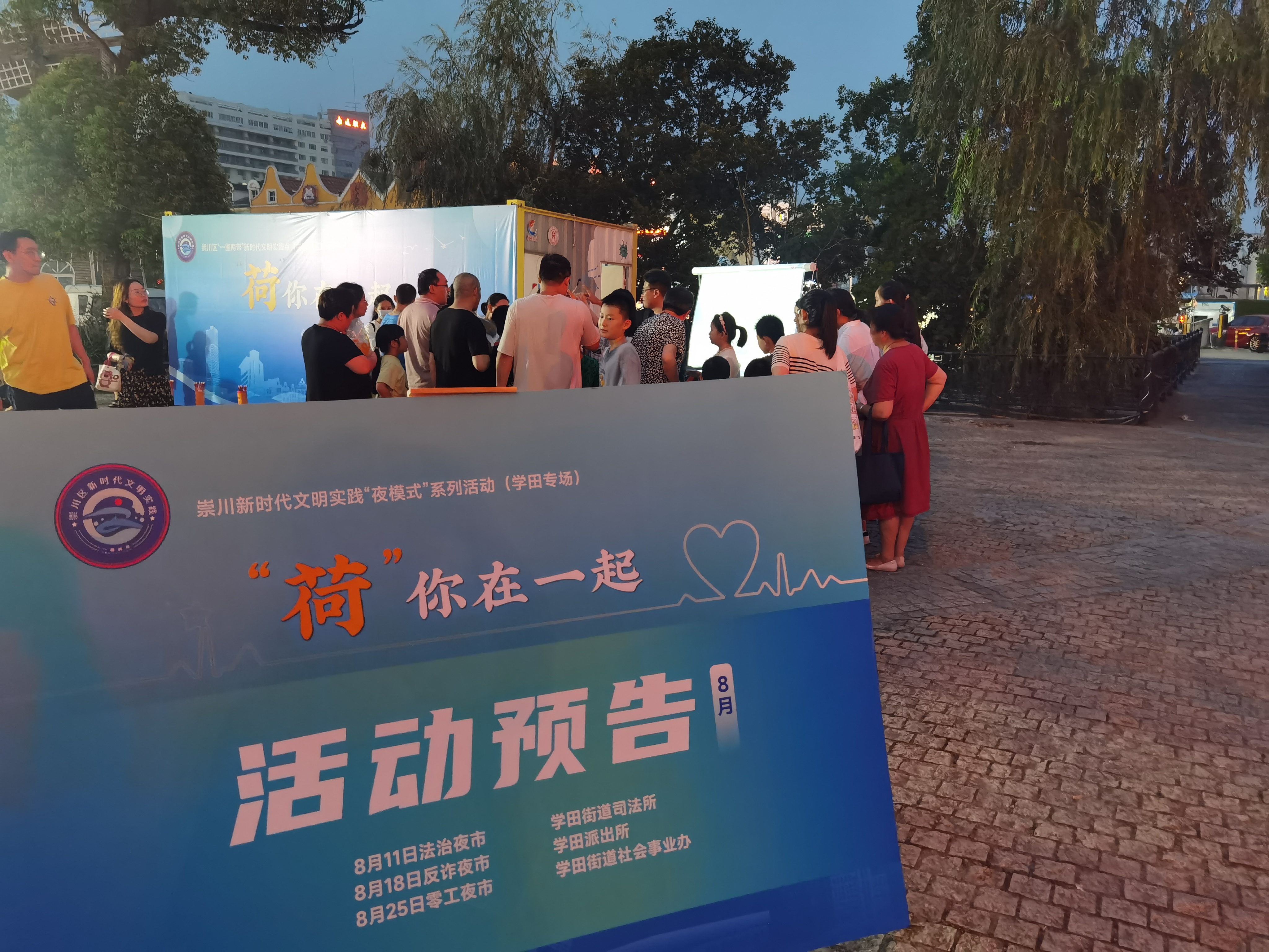 8月11日晚,首场“荷”你在一起——荷兰街新时代文明实践点“周末法治夜市”主题活动正式开市,本次活动由崇川区文明办和崇川区司法局联合主办,学田街道新时代文明实践所和学田司法所共同承办,崇川区司法局党组书记、局长陈红霞参加活动。