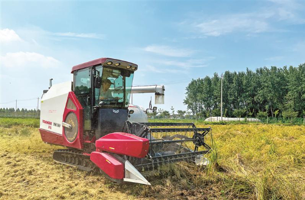 昨天,新吴区鸿山街道无锡从心农业科技发展有限公司水稻种植基地迎来了早稻收割。这次收割的是4月底第一批插秧的70亩日本顶级优质水稻,首批收割的水稻,籽粒饱满金黄,预计亩产在450斤。(宗晓东)