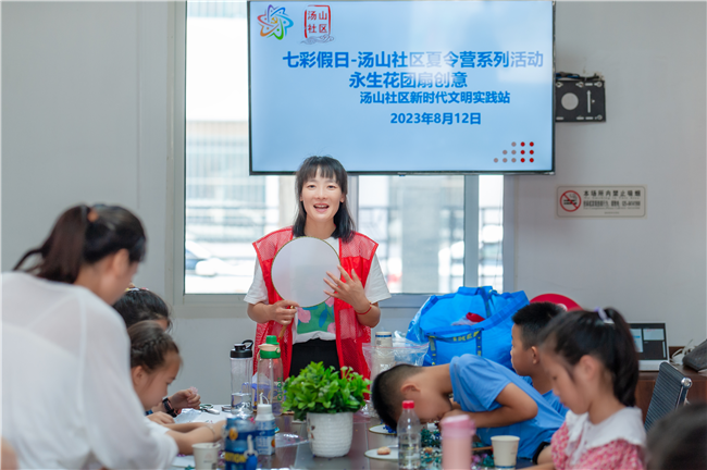 为了弘扬中国传统团扇文化,增加儿童动手动脑能力,近日,南京市江宁区汤山街道汤山社区新时代文明实践站、汤山社区关工委携手汤山源梦开展夏令营系列小组活动,通过“碰杯子”小组游戏和“永生花团扇”手工锻炼的方式提高儿童自助自强能力。