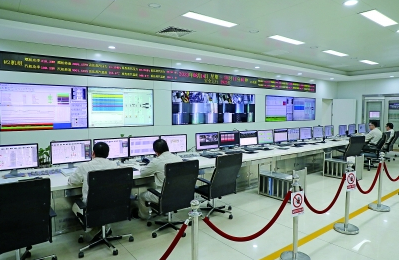 图为8月14日,工作人员正在燃机集控室监督检查。(鲍祎珺)
