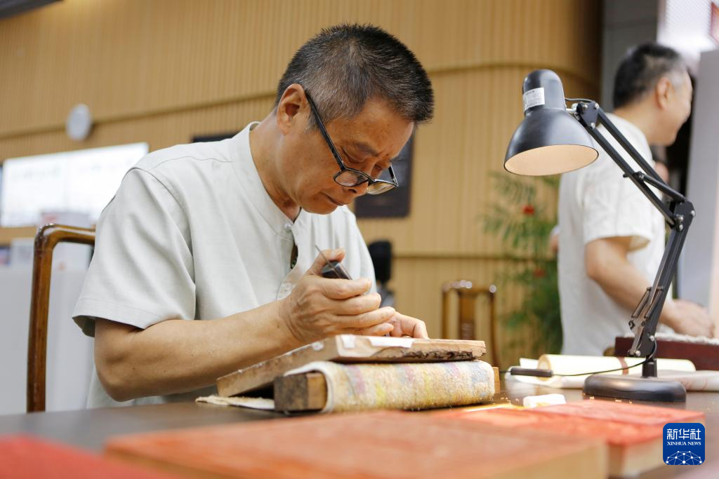 8月22日,在扬州市图书馆,江苏省雕版工艺美术大师沈树华在“古籍里的扬州运河文化”市集上为市民展示雕刻技艺。
