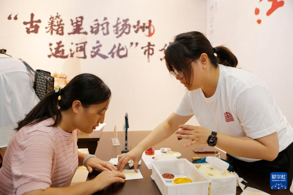 8月22日,市民在扬州市图书馆“古籍里的扬州运河文化”市集参观、体验。