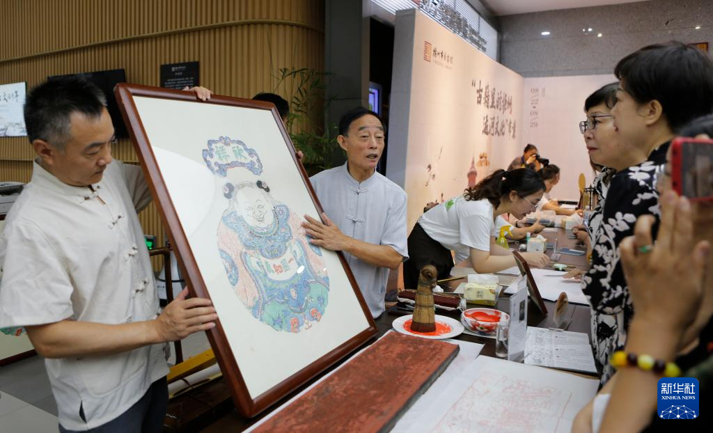 8月22日,在扬州市图书馆,雕版印刷技艺代表性传承人李江民在“古籍里的扬州运河文化”市集上为市民展示雕版印刷品。