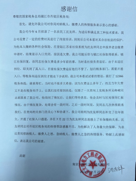 近日,丹徒区税务局收到了一封来自南京大瑞电力工程有限公司的感谢信,信中对丹徒区税务局积极协调和妥善解决职工缴费难题表达了真诚的谢意,充分肯定了税务部门应缴费人之所急,想缴费人之所想,主动担当作为、热情周到的服务。