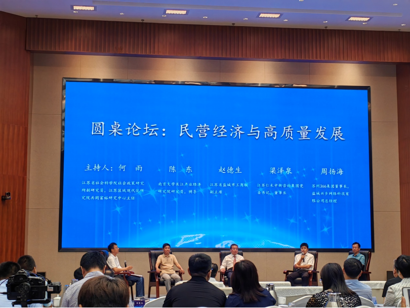 此后的圆桌论坛环节,南京大学长江产业经济研究院博导陈东、江苏省盐城市工商联副主席赵德生及江苏仁禾中衡咨询集团董事长梁泽泉、苏州366集团董事长周扬海等专家和嘉宾,以“民营经济与高质量发展”为主题,从理论和实践两方面探讨了民企如何增强信心、更有效地投身于高质量发展。江苏区域现代化研究院共同富裕研究中心主任何雨主持圆桌论坛。