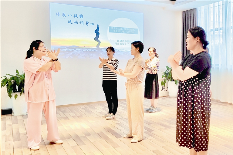 近日,周庄益家人公益坊开展健身气功八段锦培训。在老师的指导下,居民们学习了八段锦的动作,感受了其对身体的调节作用,增加了对传统文化的热爱,丰富了夏日生活。(张政凯 张予希)