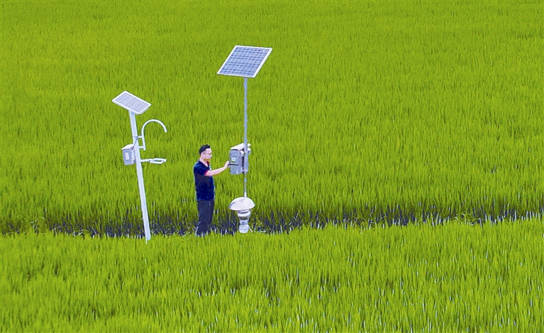 眼下正值晚稻生长的关键期,也是病虫害防治的最佳时期,使用绿色防控措施可控制病虫害发生、减少化学农药使用量,进一步提升稻米品质。图为昨天上午,华士镇华西村高品质稻米种植基地内,农技人员正在诱捕器旁查看病虫害防治情况。(丁家骏)