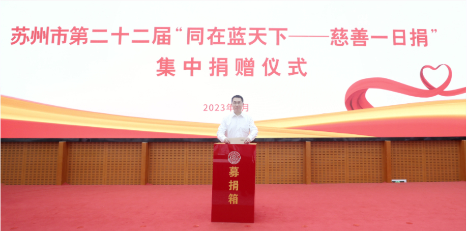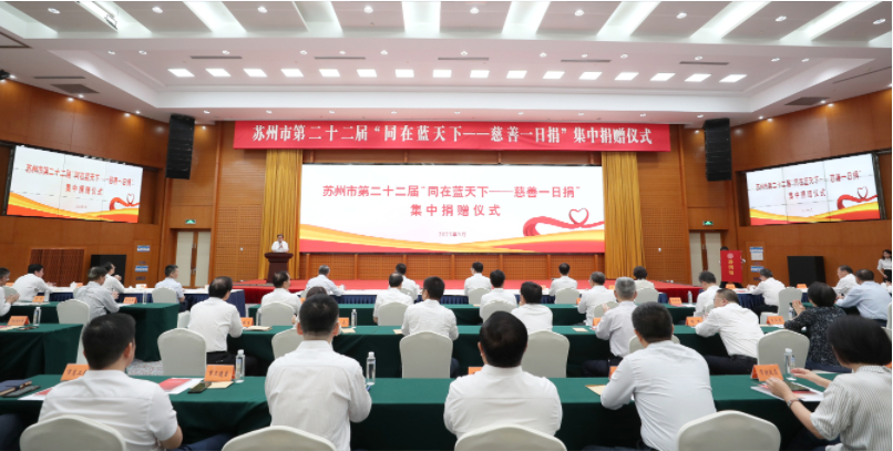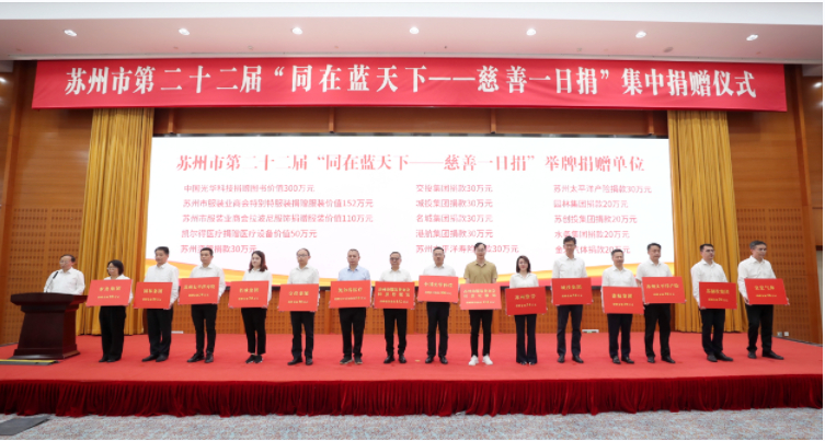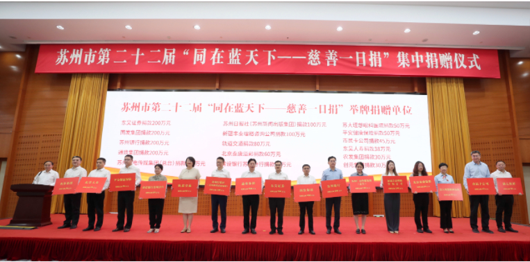 在第八个“中华慈善日”到来之际,苏州市举行第二十二届“同在蓝天下——慈善一日捐”集中捐赠仪式。苏州市委书记曹路宝,市委副书记、市长吴庆文,市人大常委会主任李亚平,市政协主席朱民,市委副书记黄爱军等市领导带头捐赠。广大机关、企事业单位和社会各界爱心人士积极响应,现场31家爱心企业和单位共举牌捐赠款物2435万元。