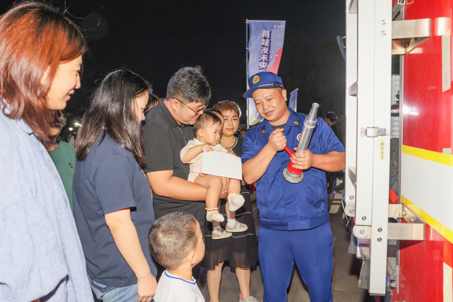 夜市吸引了不少“外援”前来“话安全”。夜市开场前,“消防安全宣传岗亭”早早开到了现场,吸引了不少小朋友前来围观,消防救援人员现场辅助小朋友试穿消防演练服,向小朋友耐心讲解火情救援相关知识。来自市应急管理局的“靖小吉”“江小安”也来到夜市,他们通过互动问答的形式,用“大白话”向群众讲解应急知识。在主舞台区域,大家不仅欣赏以安全为主题的配乐诗朗诵、单口相声等丰富多彩的节目,还踊跃参与安全知识问答。
