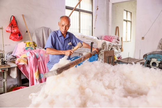 孙正元从16岁就开始背着棉花弓、敲击弓弦“弹棉花”,一弹48年,从青葱少年弹成了古稀老人。在近半个世纪的“千锤百炼”中,孙正元弹的棉絮质量赢得了顾客的信任,不少顾客一家三代结婚用的新棉被都是他给做的。“孙师傅,这次又要辛苦你啦。”村民苏美珍特地找到孙正元,为即将结婚的孙女定做两床手工棉被。