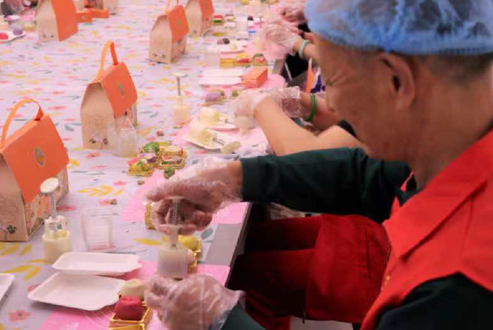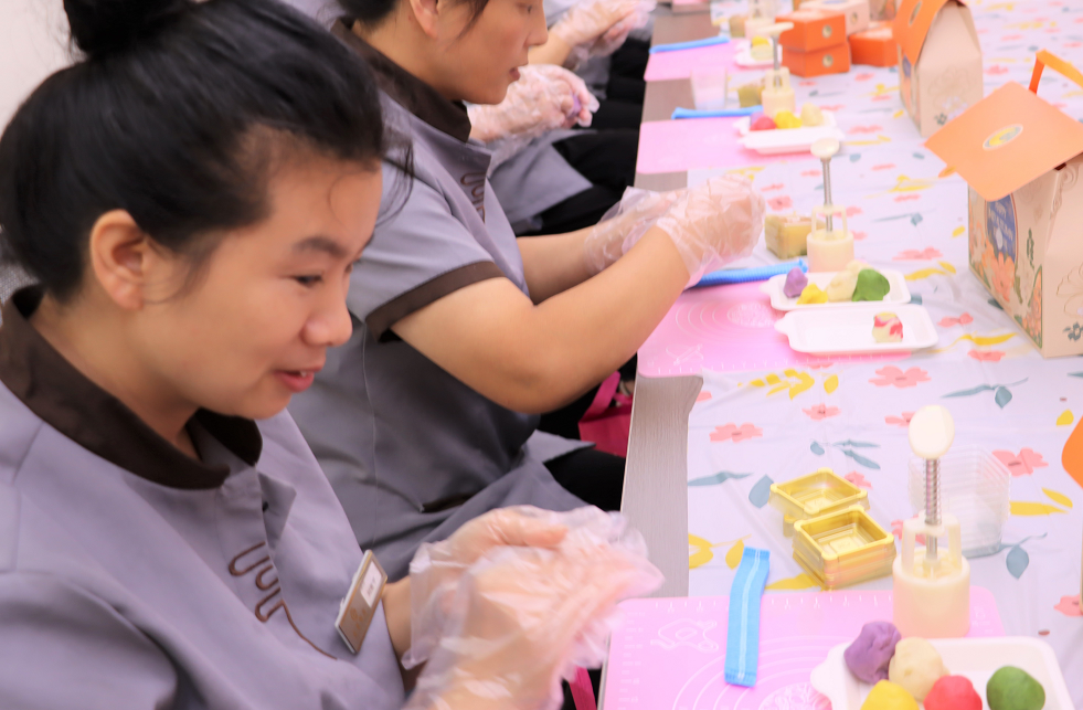 活动开始,老师首先为大家宣讲了中秋节的由来,习俗,拜月、赏灯、话团圆等话题,通过老师的讲解、互动,大家对中秋传统文化知识有了进一步认识。吃月饼是中秋节最重要且最具代表性的习俗之一。桃山皮月饼则是一种制作方便、容易上手又不失美味的新型月饼。活动现场,烘焙老师手把手地教大家制作月饼方法:首先将面皮搓圆摊平,放馅,收口,合拢放入模具一压,一个个精致漂亮的桃山皮月饼就诞生了。大家都迫不及待地制作起来,一边制作月饼,一边齐声欢唱着,共同祝福伟大祖国的繁荣富强。