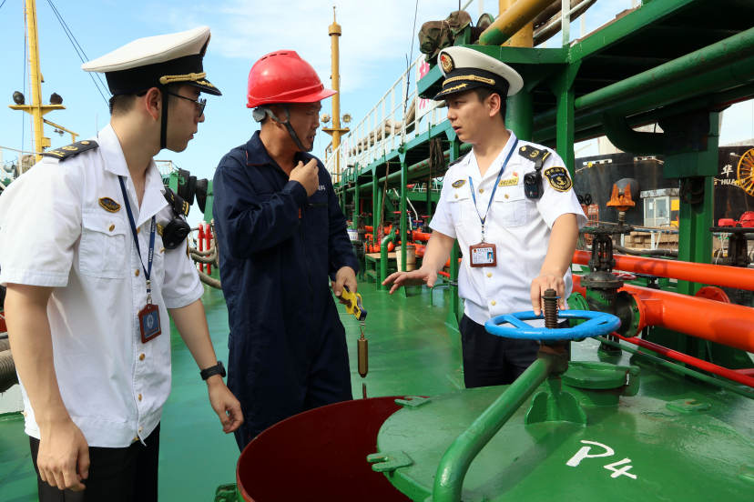 执法人员对化学品船舶管道系统安全实施现场检查