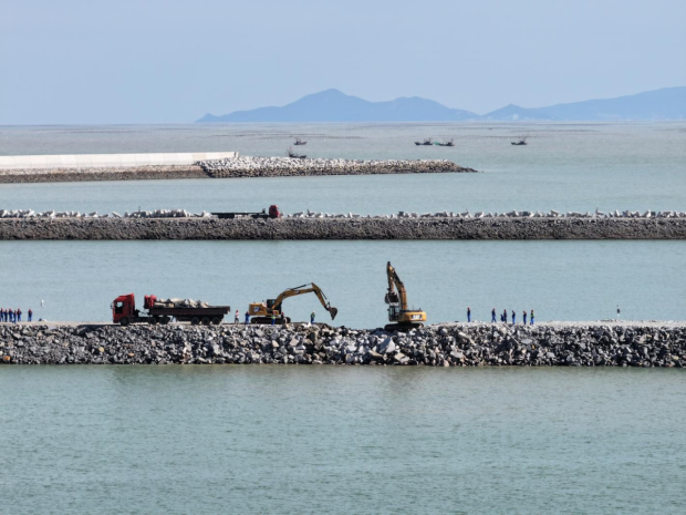 上午7点,在江苏华电赣榆LNG接收站码头项目现场,50辆标载运输车一字排开,每车承载约45吨石料,在合龙口东西两侧同时推进,经过约10个小时的连续作业,卸料80车次,共抛石约3240吨,顺利完成护岸合龙任务。