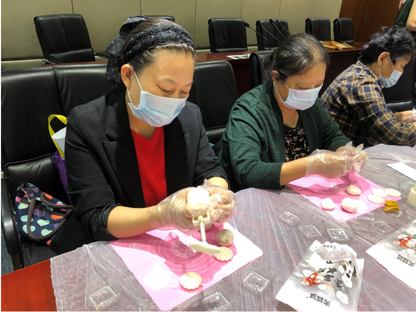 接着,主持人带大家进入“民俗体验环节”——做月饼、制灯笼。主办方事先准备好了制作月饼的模具、面粉、熟糕粉,以及红豆沙、莲蓉、紫薯、南瓜等馅料,待月饼皮和好以后,工作人员现场示范了制作月饼的步骤,并讲解了做月饼时需要注意的事项,大家围在一起开始动手制作月饼,现场欢声笑语,好不热闹。当一块块精美的月饼成型时,大家喜悦之情溢于言表。